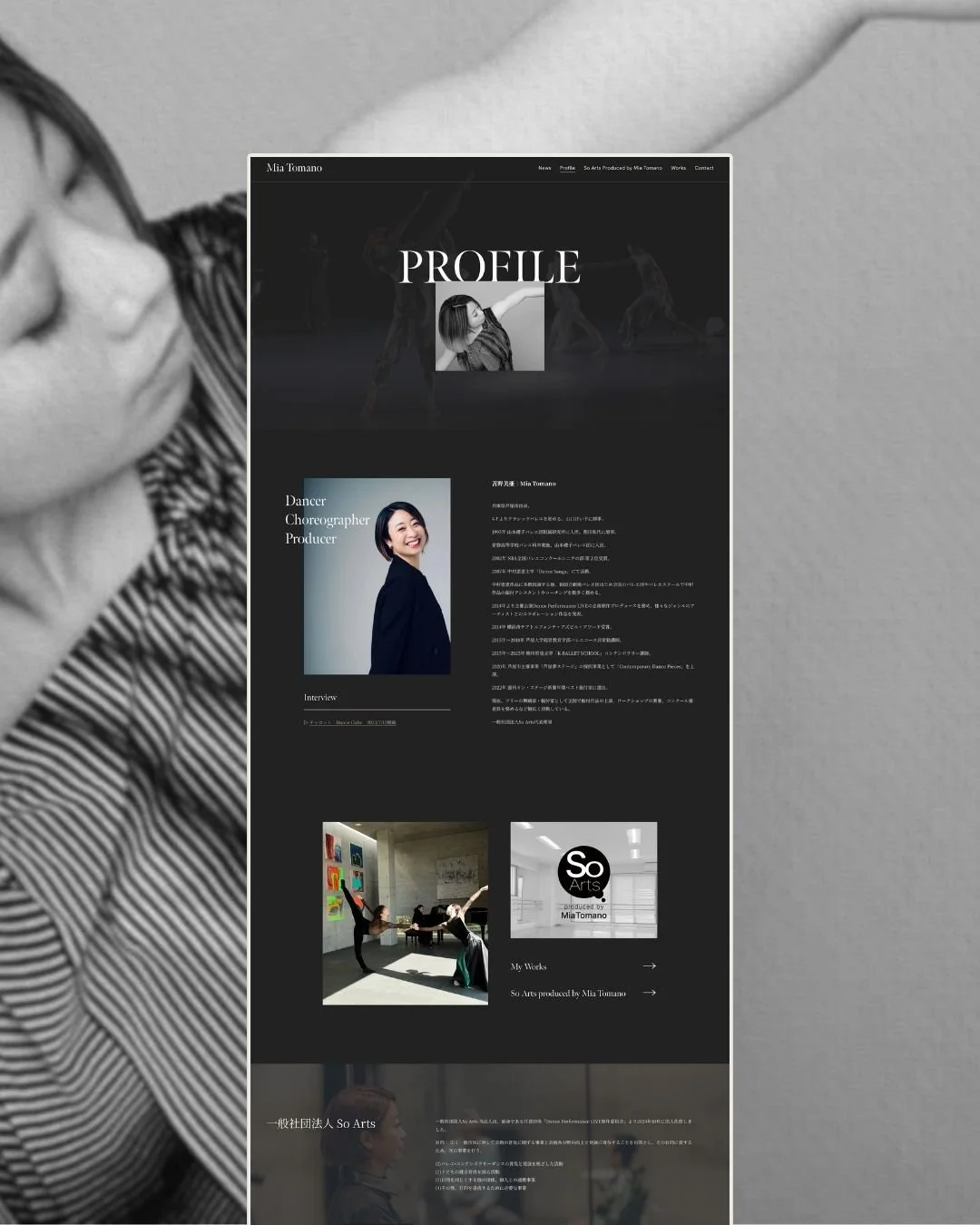 舞踊家・振付家・プロデューサーとして、舞踊(バレエ・コンテンポラリー)を軸にした多様な表現と活動を行なっている、苫野美亜さんのWebサイトをデザインさせていただきました。